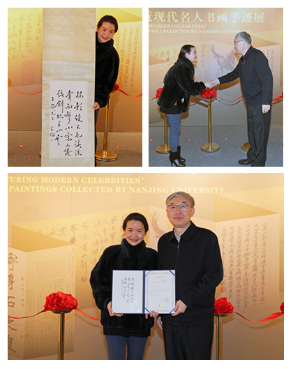 On behalf of Professor Gu Ying of Nanjing University of the Arts, Miss Qin Lan from Qingliang Academy of Calligraphy and Painting made a donation to NJU of a calligraphy by Luo Jialun, President of National Central University (predecessor of NJU). President Lyu presented her with the collection certificate.
