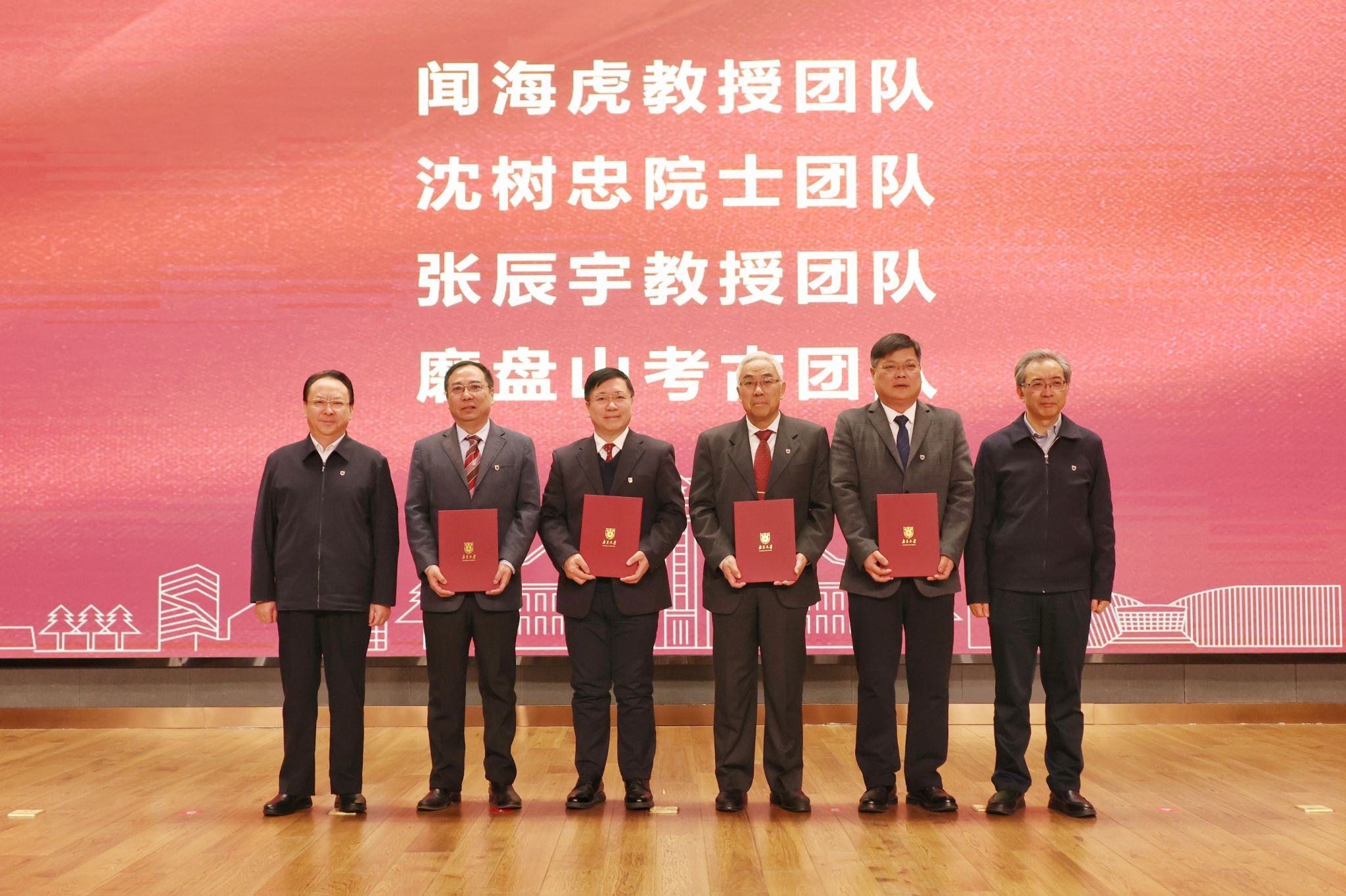 The meeting also announced the "2024 Outstanding Contribution Award." Tan Tieniu and Tan Zhemin presented "NJU Award for Major Contribution to Scientific Research" to Professor Wen Haihu's team, Professor Shen Shuzhong's team, Professor Zhang Chenyu's team and the Mopanshan Archaeological team.