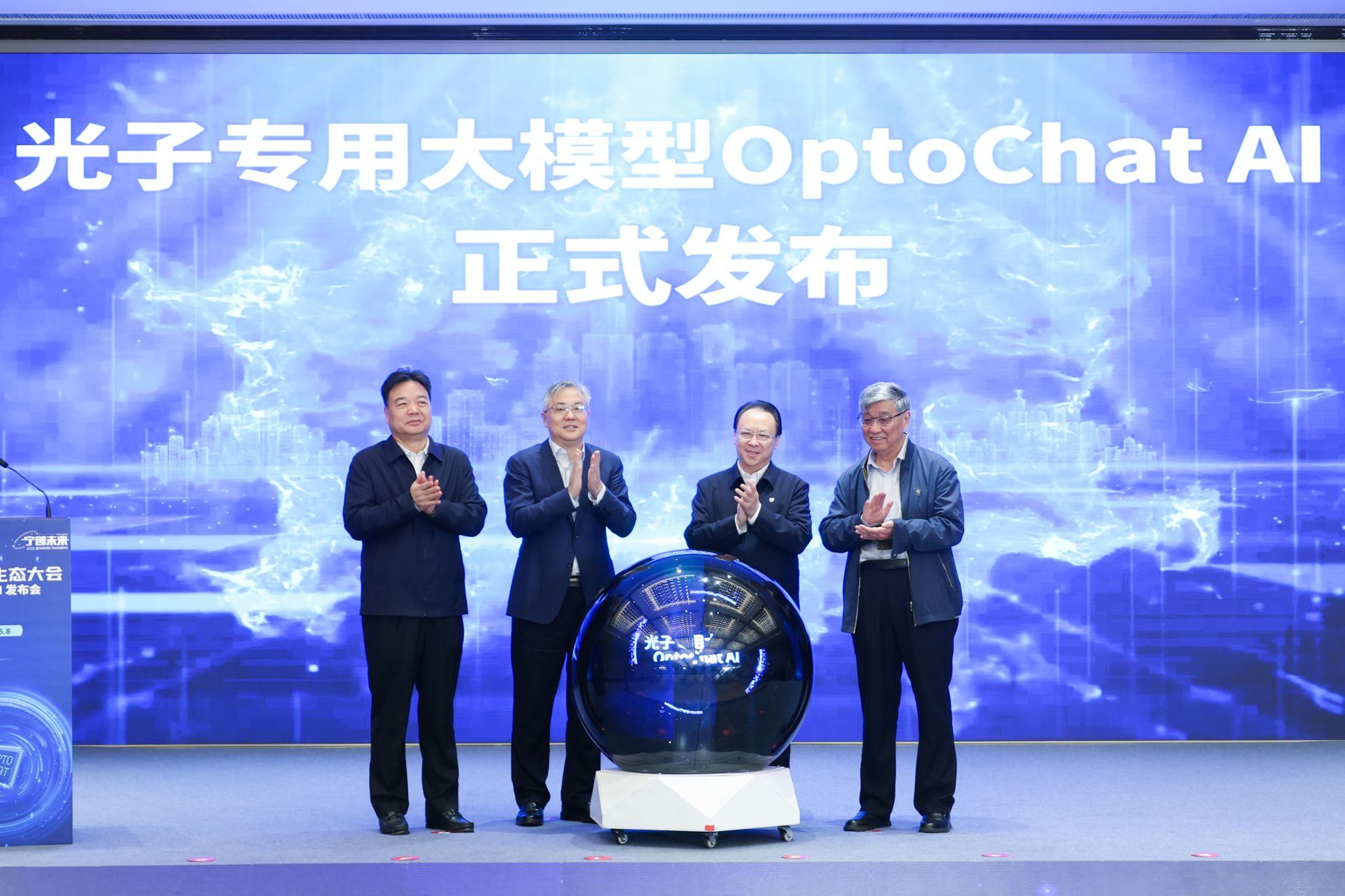 Zhou Hongbo, Tan Tieniu, Lu Weidong, and Zhu Shining jointly launched the release ceremony of the OptoChat AI photonics model.