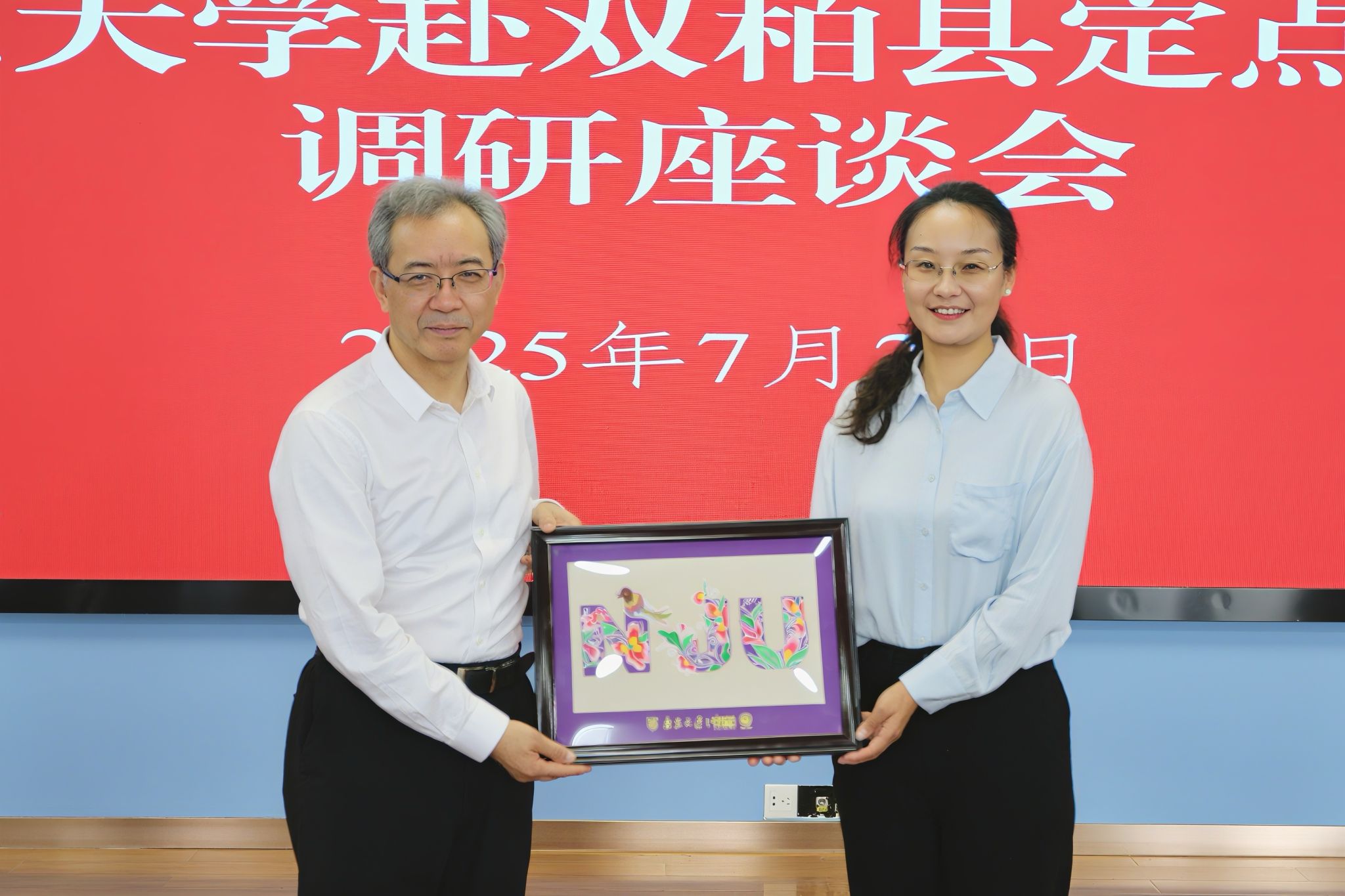 During the symposium, ceremonies were held for the donation of pairing assistance special fund, books and cultural shirts, and the signing of a tripartite cooperation agreement between NJU’s General Office, Shuyang Middle School, and Shuangbai No. 1 Middle School. Shuangbai County presented Yi embroidery works to NJU as a token of gratitude.
