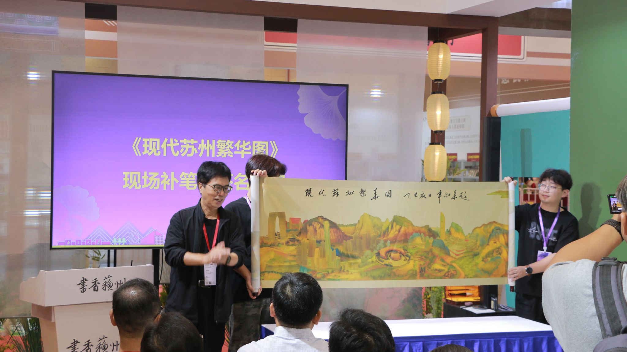 作为创作者之一的著名画家徐惠泉,用视频的方式介绍了此次在创作《现代苏州繁华图》过程中的构思、探索和对人工智能艺术本质的思考。视频还同步展示了徐惠泉在画作上后期补笔、落印的影像资料。章剑华现场执笔泼墨,在《现代苏州繁华图》长卷上题写画名并落印,完成了艺术家对艺术作品的最终的命名和定位。