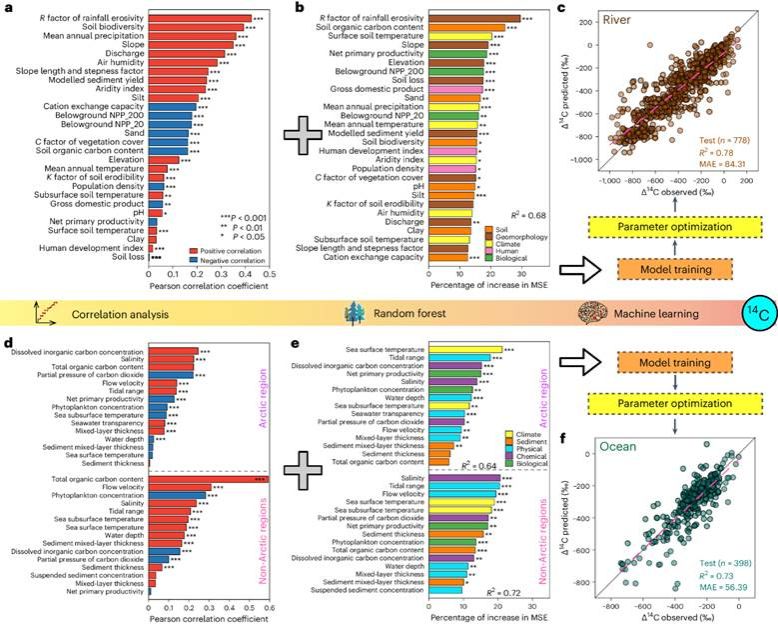 图- 1河流颗粒物和海洋沉积物Δ14C数据的机器学习模型构建。基于相关分析(a, d)和随机森林模型(b, e)明确环境变量在驱动河流颗粒物(a-c)和海洋沉积物(d-f) Δ14C数据中的重要性;基于特征选择的支持向量机模型对全球河流颗粒物(c)和海洋沉积物(f) Δ14C值的预测性能图。