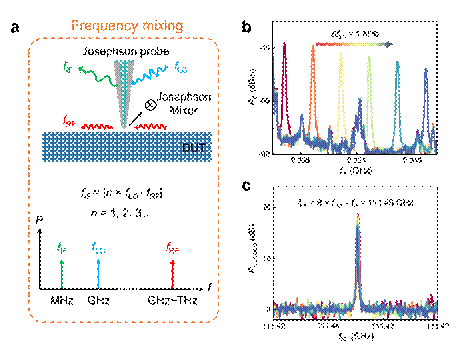 约瑟夫森探针显微镜在保证高空间分辨能力的同时,能够利用约瑟夫森结对近场微波信号进行高灵敏度的检测。经过多次的工艺迭代优化,目前约瑟夫森探针的最高相干探测频率已超过200 GHz。利用约瑟夫森结的高度非线性和混频技术,还可以实现对待测样品表面任意点近场微波的高精度频谱测量(图3)。以上功能进一步丰富了约瑟夫森探针显微镜的应用场景,其选频成像、频谱解析等功能在芯片的近场检测技术中具有极大的应用潜力。