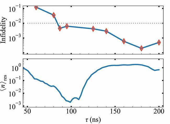 图2:在FSR = 1.4 GHz时实现CZ门的保真度和FSR = 0.2 GHz时谐振腔内残余光子数。