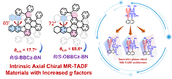 手性多重共振热激活延迟荧光(CP-MR-TADF)材料由于其可以兼具高色纯度、高发光效率和圆偏振发光(CPL)等性质特点,在制备圆偏振有机电致发光器件(CP-OLED)以实现3D和广色域显示中展现出巨大的前景。然而,该领域仍面临诸多挑战,其中最突出的是如何提高材料的不对称因子(g)。其计算公式为g = 4×|μm|×|μe|×cosθe,m/(|μm|2+|μe|2) (μm、μe和θ分别表示磁偶极跃迁矩、电偶极跃迁矩及二者之间的夹角)。因此,为了实现较高的g值,需要考虑三者的调控。 最近,化学化工学院郑佑轩课题组在手性发光材料的开发和CP-OLED器件制备方面取得了系列研究进展(图1)。