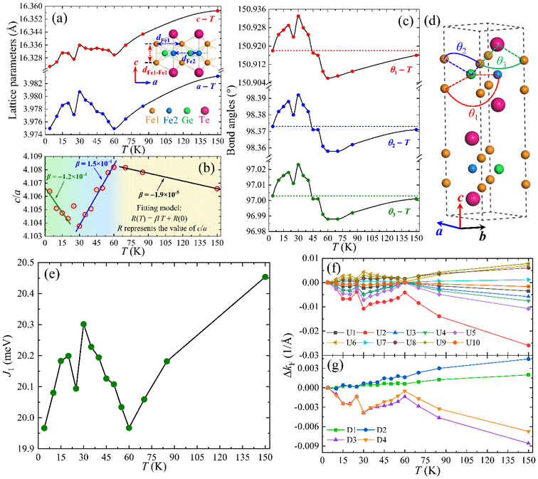 图2. (a-c) 二维Fe3GeTe2各晶格参数随温度的变化关系。 (d) Fe3GeTe2晶格结构示意图。(e-g) 二维Fe3GeTe2中Ruderman-Kittel-Kasuya-Yosida相互作用的第一性原理计算结果。