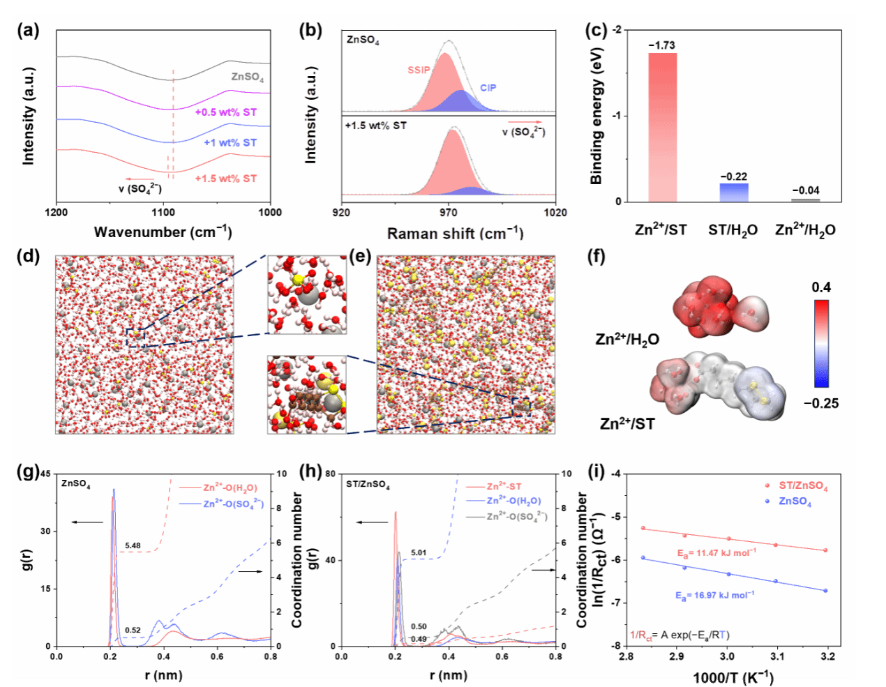 图2所示为ST分子在电解液中的作用机制。ST分子的引入优化了电解液的溶剂化结构,抑制了锌腐蚀和析氢副反应。