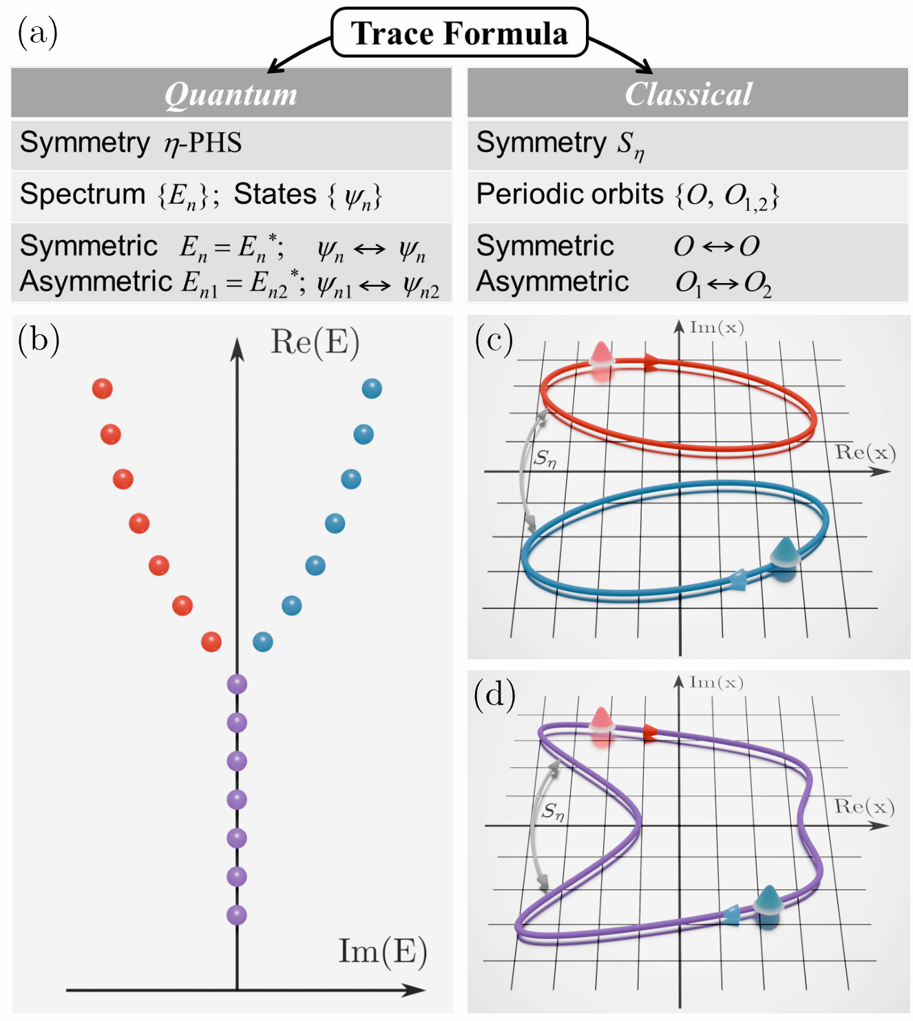 图1. 非厄米物理的量子-经典对应关系。(a) 量子特性与经典特性通过求迹公式相互关联。(b-d) 非厄米能谱与半经典轨道对应关系示意图。(b) 由实数和复共轭对组成的能谱。(c) 复坐标空间中互为Sη对称的两个半经典轨道,对应成对的复共轭能级。(d) 具有Sη对称的轨道,对应实能量本征值。本征能量与对应轨道采用相同颜色标示,Sη对称操作由灰色双向箭头表示。